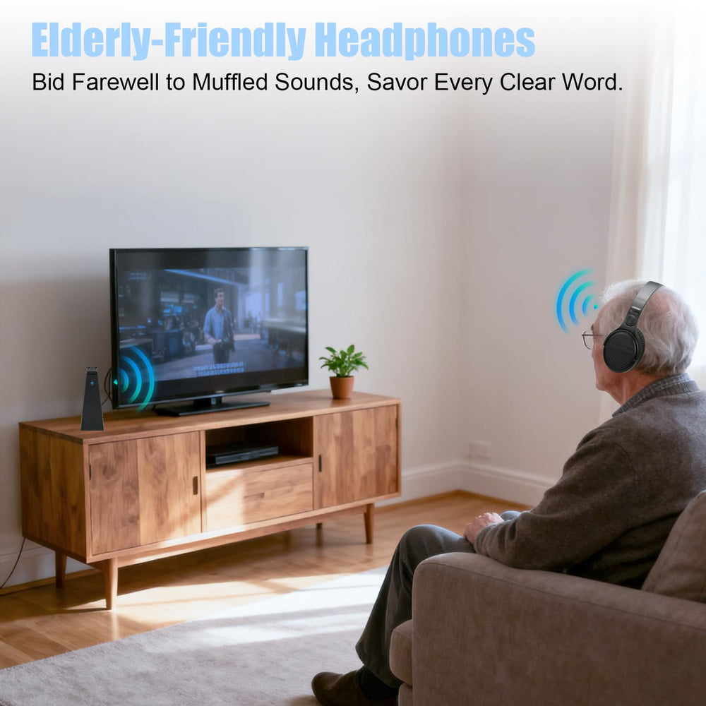 Oversized control buttons make volume adjustment, power on/off, and EQ switching intuitive — no fumbling, no frustration. Whether your eyes or hands aren't what they used to be, every control is right where you expect it. Dual-mode connectivity means one headphone works for TV (2.4G) and phone calls or streaming (Bluetooth 5.3) — no need for separate devices.