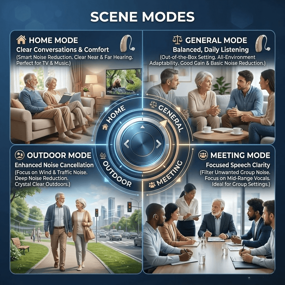 Optimized sound settings for different environments such as conversation, indoor listening, and outdoor situations.
